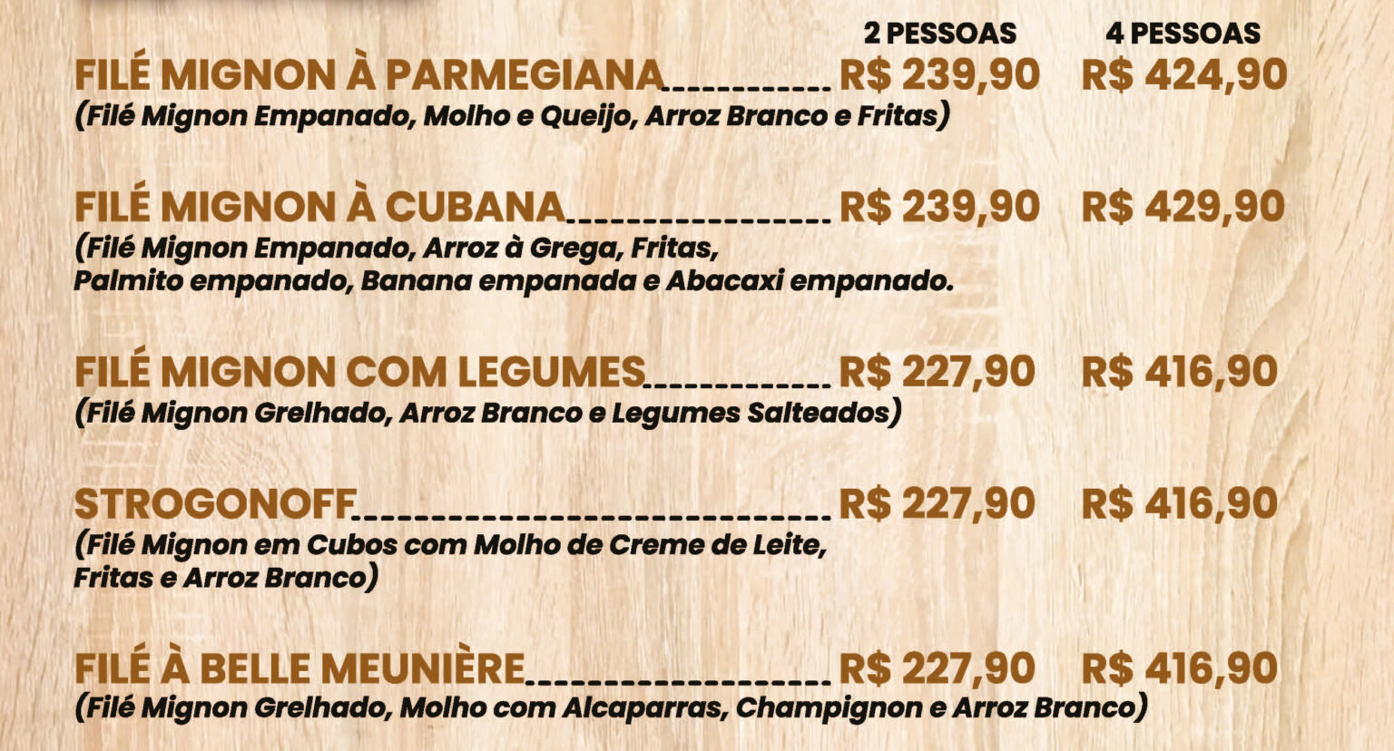 (Filé Mignon Empanado, Molho e Queijo, Arroz Branco e Fritas)